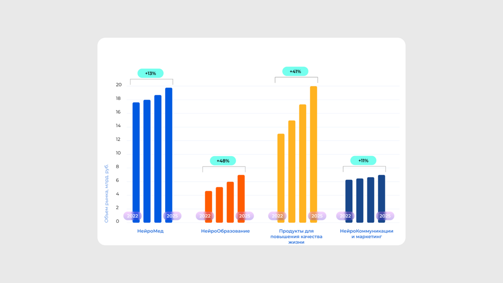 Поэтому для оценки инвестиционных перспектив отрасли аналитики разделили ее на четыре направления: медицина, продукты для повышения качества жизни, образование, нейромаркетинг.