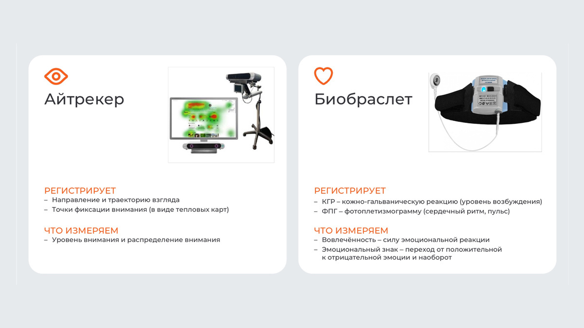 Для сбора объективных данных использовались айтрекинг (отслеживание движений глаз), а также биометрические браслеты (регистрация кожно-гальванической реакции, сердечного ритма и пульса). Таким образом специалисты измерили неосознанные реакции: уровень концентрации, распределение внимания, вовлеченность и эмоциональное возбуждение.