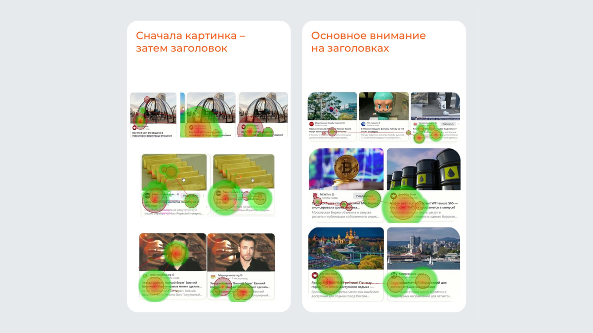 Текст под заголовком читают не все; при интересе пользователь сразу переходит к статье, а при сомнениях — детальнее изучает элементы публикации. В среднем, фиксаций взгляда на изображениях немного больше, чем на заголовках, при этом кликбейтным и обычным заголовкам уделяется равное внимание.