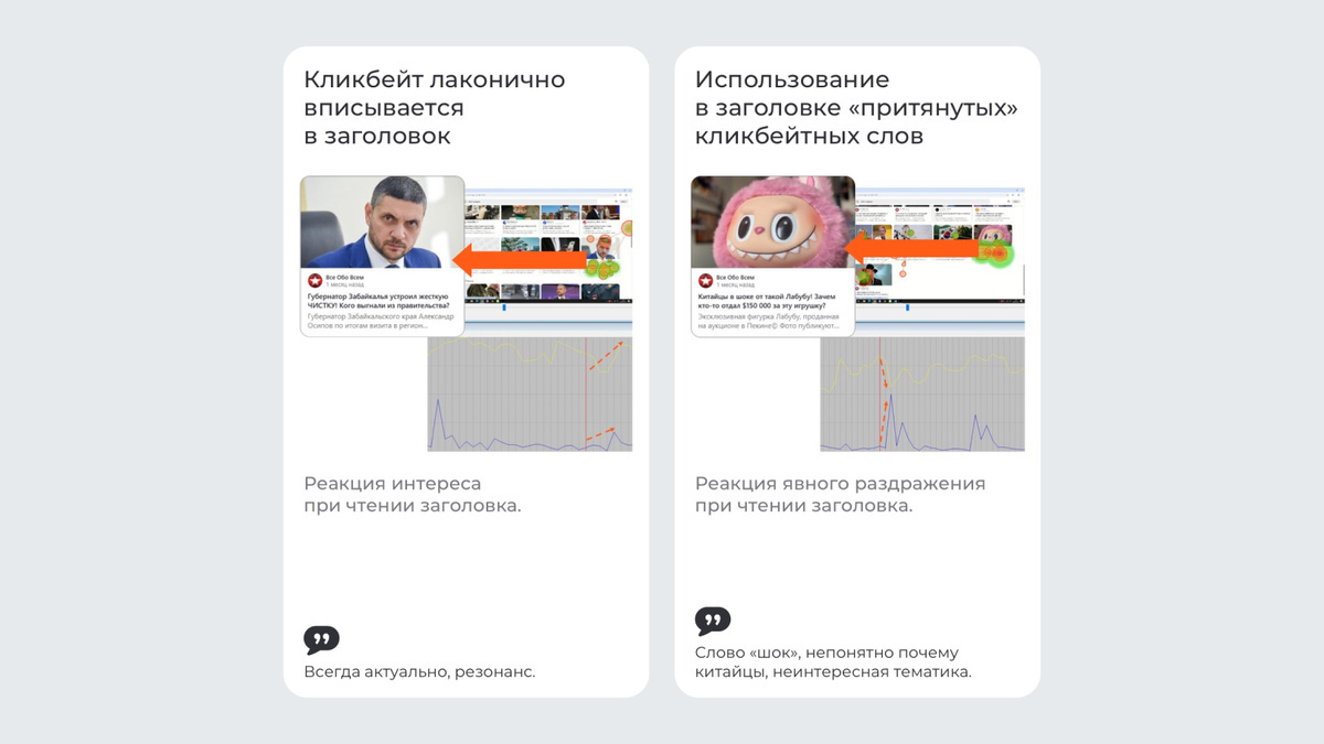Большинство респондентов называют кликбейт признаком низкого качества контента, а СМИ, по общему мнению, используют его в погоне за охватами. При этом на физиологическом уровне такие заголовки остаются наравне с обычными.